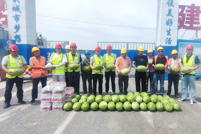 烈日炎炎、驕陽似火,進入7月以來,連續(xù)多日發(fā)布高溫橙色預(yù)警,為做好高溫期間安全生產(chǎn)工作,保障現(xiàn)場施工安全,匯通集團分會組織開展“夏送清涼”慰問一線活動,深入工地、走近工友,把清涼送到施工一線、把關(guān)懷送到職工心坎里。 7月6日,分管經(jīng)理袁鵬、綜合辦公室主任馬婕帶領(lǐng)匯通集團分會小組走進項目部,開展“夏送清涼”慰問一線活動,為每個施工班組送上清熱解渴的礦泉水、西瓜、綠豆等防暑降溫物資,對炎炎夏日奮戰(zhàn)在一線的廣大職工及勞務(wù)人員表示親切慰問,叮囑一線人員要保證人身安全,適當科學(xué)合理安排作息時間,根據(jù)氣溫情況,避開高溫時段,切實做好防暑降溫工作,同時要求各施工隊伍堅持“安全高于一切、質(zhì)量重于泰山”理